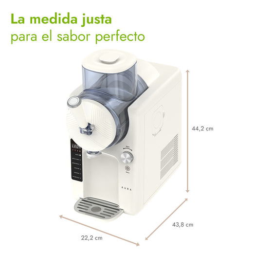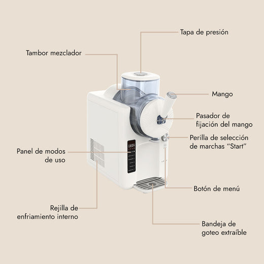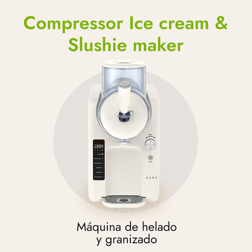 La Máquina de Helado Aura combina facilidad de control y un servicio práctico con su Pantalla LED fácil de leer, que muestra claramente los 6 Modos de uso disponibles (Granizado, Helado Suave, Granizado con licor, Bebida fría, Batido, y Extracción/Limpieza), y un Resistente y fácil de usar manillar dispensador que te permite servir tu postre favorito de forma clásica, con solo tirar de la manilla grande.